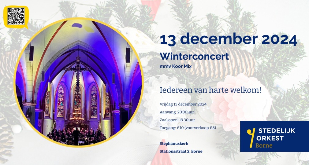 Op 13 december om 20.00 uur geeft Stedelijk Orkest Borne een sfeervol winterconcert in de St. Stephanuskerk in Borne. Afgelopen jaar zochten zij de samenwerking op met het Koninklijk Hengelo’s Mannenkoor, deze keer is koor Mix uit Zenderen uitgenodigd.